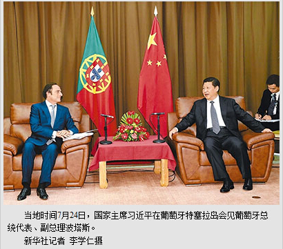 波塔斯表示,葡中两国成功解决了澳门问题,为国与国之间解决历史遗留问题树立了榜样。前几年,当葡萄牙面临经济困难时,中方向我们提供了宝贵支持和帮助,我们感谢中国。葡方赞赏中国梦,相信中国将为促进世界和平与发展发挥越来越重要的作用。葡萄牙愿意发展同中国的全面战略伙伴关系,加强政治对话,扩大经贸、投资、海洋、旅游等领域合作。葡萄牙经济正在好转,欢迎中国企业积极参与其中。葡方愿意积极促进欧盟同中国关系发展。波塔斯祝贺习近平拉美之行取得成功,表示葡方愿意利用自身优势,同中方加强在拉美、非洲事务中的合作。