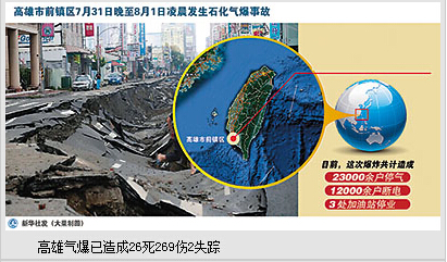 本报高雄、台北8月1日电(记者吴亚明、陈晓星)高雄市前镇区7月31日晚至8月1日凌晨发生石化气爆事故,截至记者发稿时,共有26人罹难,另有269人受伤,2人失踪。目前,救灾工作正在紧张进行。