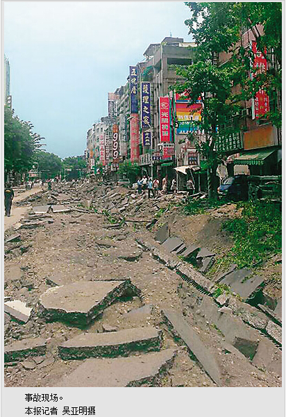 本报记者今早赶到出事现场,空气中充满了呛鼻的油气味道,四下满目疮痍,三多一路、凯旋三路、武庆三路已然成为壕沟,路边的商店和民宅玻璃多被震掉,有不少车辆毁损,甚至有轿车被炸飞到4层楼顶。此次爆炸,波及面积3平方公里,周遭不少地方出于停水、停电、停气状态。事发后,台湾相关各方紧急驰援高雄,搜救、善后。高雄市也在多所学校设置灾民安置点。