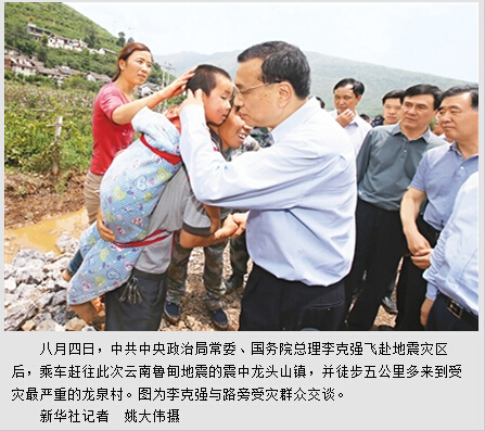 据新华社昆明8月4日电 (记者陈二厚)3日下午4时30分,云南省鲁甸县发生6.5级地震。党中央、国务院高度重视,中共中央总书记、国家主席、中央军委主席习近平和中共中央政治局常委、国务院总理李克强立即作出重要指示和批示。随着灾情扩大、余震频发和公布的死亡人数骤然增多,专家分析认为这是当地百年以来最强地震,已启动国家一级响应。4日一早,李克强代表党中央、国务院,代表习近平总书记急飞灾区察看灾情,现场指挥抗震救灾工作。