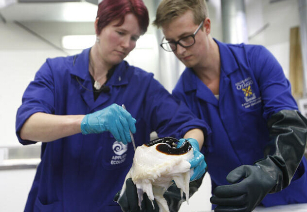 这只巨型鱿鱼还被发现携带有卵子,是迄今为止第二个带有卵子的完整鱿鱼标本。图中科学家Kat Bolstad和她的学生Aaron Boyd Evans 正在检查大王酸浆鱿的嘴巴。