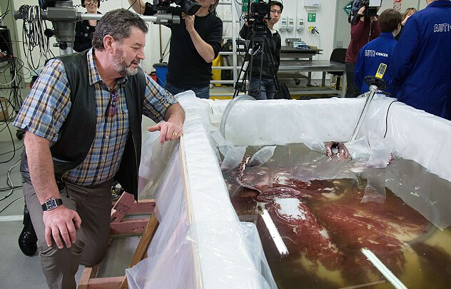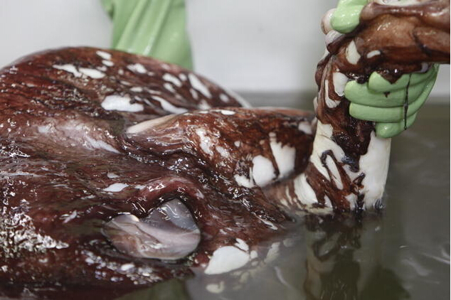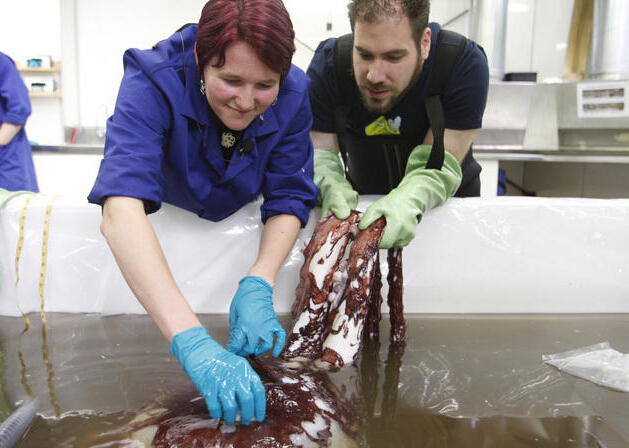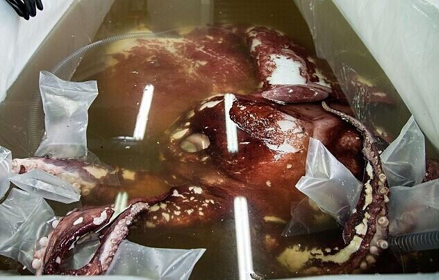 在惠灵顿国际博物馆实验室中解冻的大王酸浆鱿。