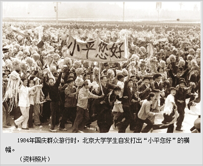 1984年的35周年国庆,因为“小平您好”横幅的出现,成为又一个经典的历史瞬间。这是国庆阅兵停顿1/4个世纪后,再度盛大举行,给刚刚踏上改革开放征程的国人以极大振奋。随后的群众游行中,北京大学学生突然举起了一个横幅,上书“小平您好”4个大字,以朴素的方式表达了人们对改革开放总设计师的敬仰。“团结起来,振兴中华”的口号在广场上空回响,凝聚着一个国家复兴的梦想。