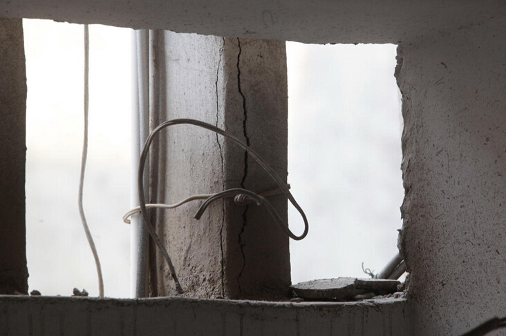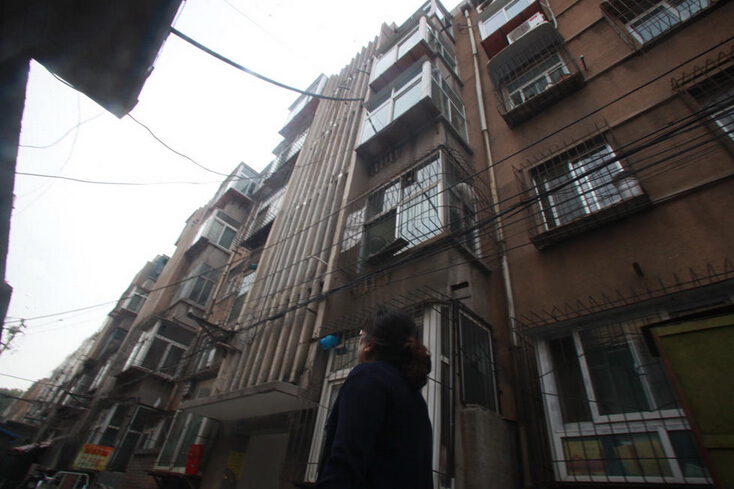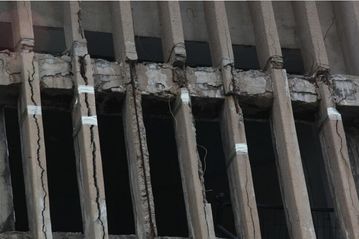 10月8日,山东济南历山东路2号一居民楼出现楼体柱子多处开裂,用透明胶带捆绑固定的情况。现场四单元顶楼位置两根悬在半空的柱子由两根绳子拽住,一些居民反映,外出家门十分担忧,有时抱头出行。