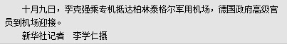 本报柏林10月9日电 (记者吴乐珺、管克江、郑红)应德意志联邦共和国总理默克尔邀请,国务院总理李克强于当地时间9日下午乘专机抵达柏林泰格尔军用机场,开始对德国进行正式访问。