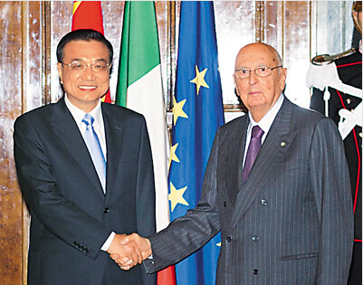 李克强首先转达了习近平主席对纳波利塔诺总统的亲切问候。李克强表示,中方愿同意大利巩固政治互信,加强务实合作和文化交流,不断深化中意全面战略伙伴关系,促进中欧关系和亚欧合作持续发展。