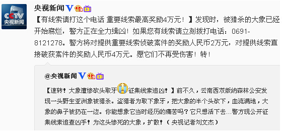 被猎杀的大象已经开始腐烂,警方正在全力缉凶。如果您有线索请立刻拨打电话:0691-8121278。警方将对提供重要线索侦破案件的奖励人民币2万元,对提供线索直接破获案件的奖励人民币4万元。