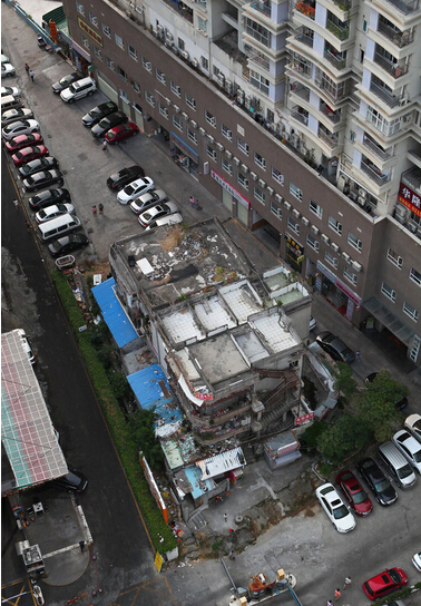 2014年10月21日,广东深圳,一座钉子楼位于中兴路,历经十年,开发商既不赔偿也不改造。刘有志/CFP