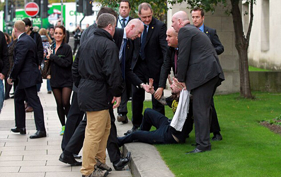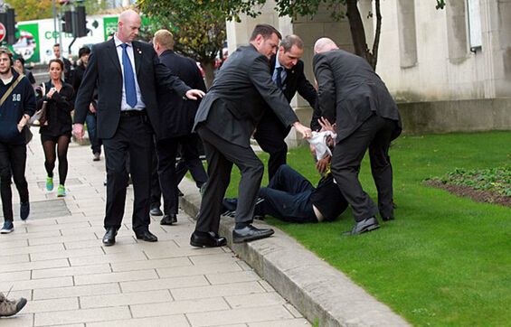 据英国媒体报道,当地时间27日,英国首相卡梅伦在走出利兹市政厅时,突然遭到一名28岁的男子当街猛推,安保人员迅速将该男子制服。