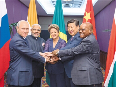 十一月十五日,金砖国家领导人非正式会晤在澳大利亚布里斯班举行,中国国家主席习近平、巴西总统罗塞夫、俄罗斯总统普京、印度总理莫迪、南非总统祖马出席。图为金砖五国领导人在会晤前合影。(详细报道见第二版)
