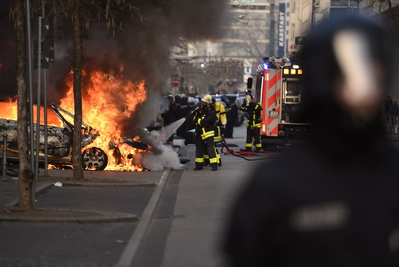 3月18日,在德国法兰克福,消防员在燃烧的警车旁灭火。新华社/法新