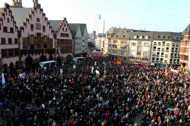 3月18日,示威者聚集在德国法兰克福罗马广场游行示威。新华社记者 罗欢欢 摄