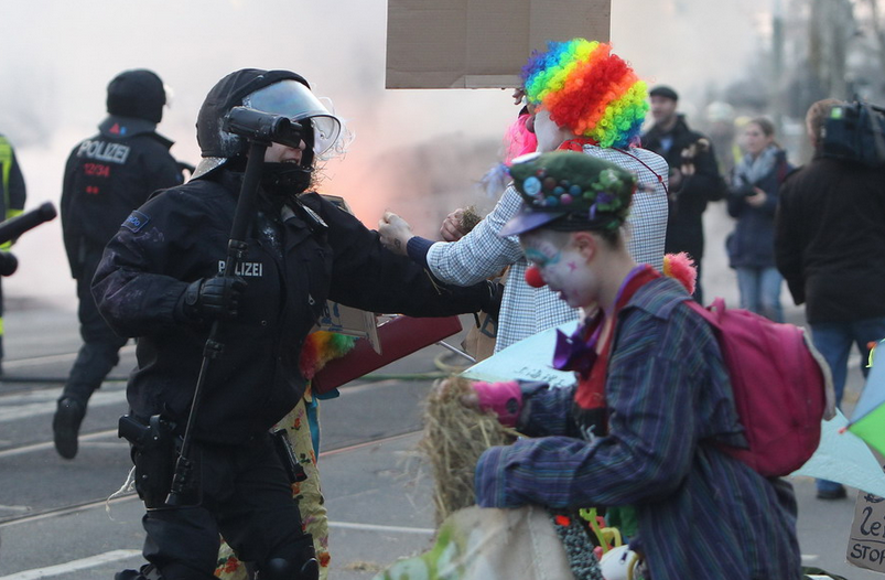 3月18日,在德国法兰克福,装扮成小丑的示威者与防暴警察发生冲突。新华社/法新