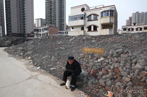 图为2015年4月7日,郑州,一位老人坐在废墟前犯愁,他的背后是即将拆迁的养老院。