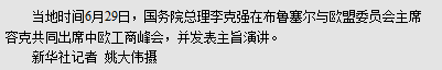 本报布鲁塞尔6月29日电 (记者吕鸿、任彦、刘栋)国务院总理李克强当地时间29日下午在布鲁塞尔与欧盟委员会主席容克共同出席中欧工商峰会,并发表主旨演讲。(演讲全文见第二版)