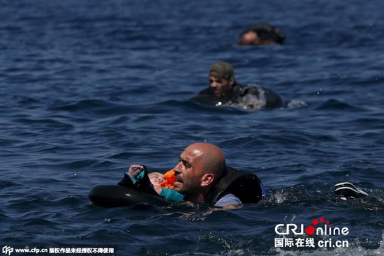 当地时间2015年9月13日,希腊莱斯博斯岛,承载叙利亚和阿富汗难民的一橡皮艇在靠近莱斯博斯岛100米远处泄气,当地民众和志愿者对难民进行了援助,难民们靠救生圈和游泳上岸。图片来源:CFP