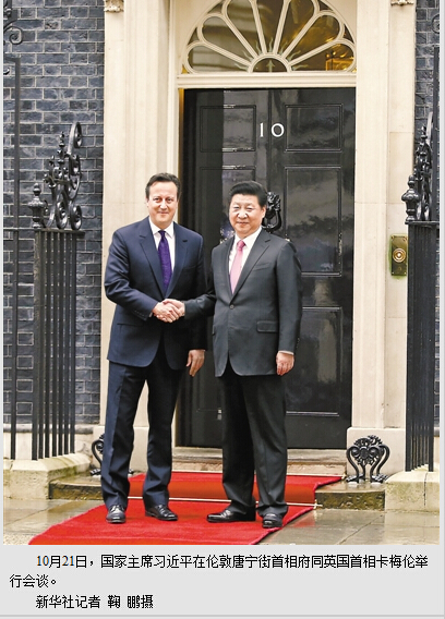 本报伦敦10月21日电 (记者杜尚泽、黄培昭)当地时间21日,国家主席习近平在伦敦唐宁街首相府同英国首相卡梅伦举行会谈。双方积极评价中英关系发展取得的成就,就双边关系及重大国际和地区热点问题深入交换意见,达成重要共识,决定共同构建中英面向21世纪全球全面战略伙伴关系,开启持久、开放、共赢的中英关系“黄金时代”。