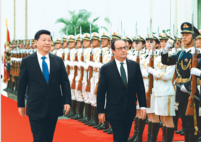 11月2日,国家主席习近平在北京人民大会堂同法国总统奥朗德举行会谈。这是会谈前,习近平在人民大会堂北大厅为奥朗德举行欢迎仪式。