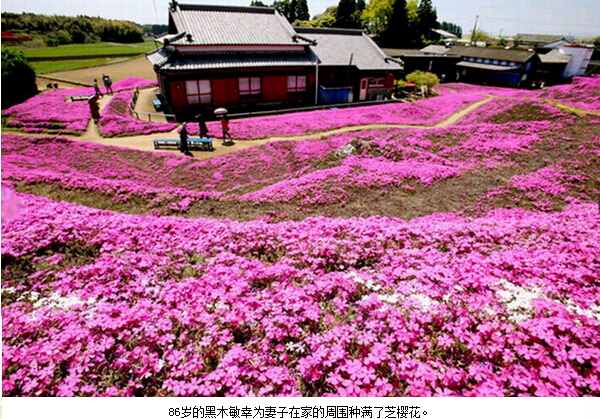 人民网2月15日电 据日本《朝日新闻》报道,在日本宫崎县新富町86岁老人黒木敏幸家的庭院内,开满了粉红色的芝樱。为了目睹这一美景,日本各地游客纷纷造访,人数最多时达到每天7000人。人们纷纷感谢坐在长椅上的老夫妇。
