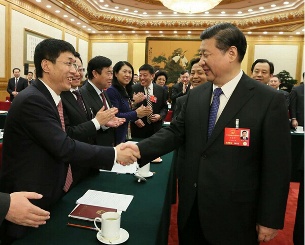 【习总书记关心黑龙江煤炭产业发展】黑龙江代表团审议时,省委书记王宪魁谈到坚决打好龙煤集团改革生存攻坚战。习近平详细了解龙煤集团生产经营,询问煤炭产量、采煤条件、设备机械化等情况。习近平仔细听取来自煤炭企业代表的发言,记下关于黑龙江煤炭资源枯竭型城市经济解困和转型发展的建议,希望企业面向市场、面向技术创新,增强企业发展活力和原生力。