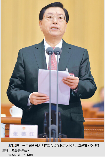 大会完成各项议程后,张德江发表讲话。他说,十二届全国人大四次会议在全体代表的共同努力下,圆满完成了各项预定任务。会议充分发扬民主,严格依法办事,保持良好会风,开得很成功,是一次民主、团结、求实、奋进的大会。会议期间,代表们肩负全国各族人民的重托,认真履行宪法和法律赋予的职责,讲大局、议大事,重实际、求实效,集思广益,凝聚共识,使会议各项成果充分体现了党的主张和人民意志的统一。