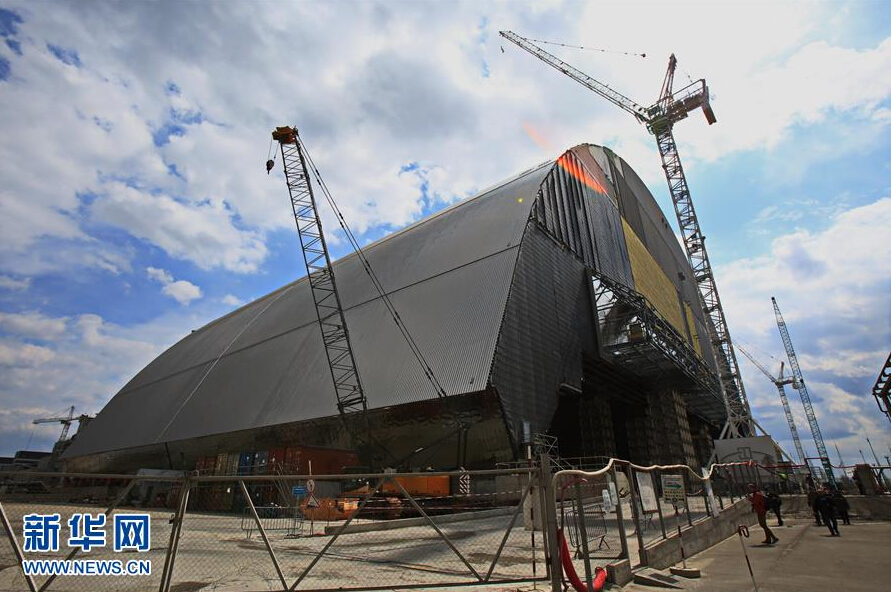 这是4月22日在乌克兰北部切尔诺贝利核电站拍摄的正在修建的拱形防护罩。该防护罩完工后将罩在核电站4号机组上,阻隔辐射的扩散。新华社记者陈俊锋摄