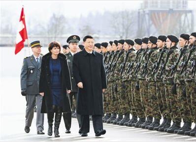 1月15日,国家主席习近平乘专机抵达苏黎世,开始对瑞士联邦进行国事访问。这是习近平在瑞士联邦主席洛伊特哈德陪同下检阅仪仗队。