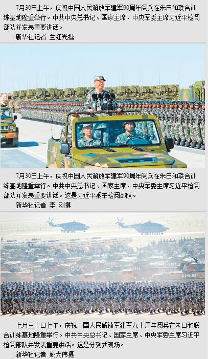 新华社内蒙古朱日和7月30日电 (记者曹智、李宣良、梅世雄)铭记光辉历史,推进强国强军。7月30日上午,庆祝中国人民解放军建军90周年阅兵在朱日和联合训练基地隆重举行。中共中央总书记、国家主席、中央军委主席习近平检阅部队并发表重要讲话(讲话全文见第二版)。