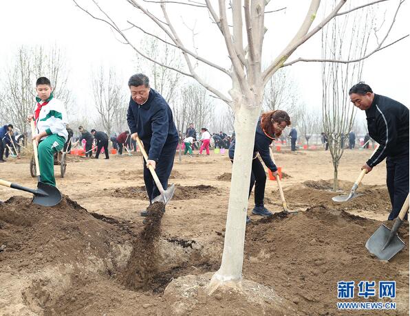 4月2日,党和国家领导人习近平、李克强、栗战书、汪洋、王沪宁、赵乐际、韩正、王岐山等来到北京市通州区张家湾镇参加首都义务植树活动。这是习近平同大家一起植树。新华社记者 谢环驰 摄