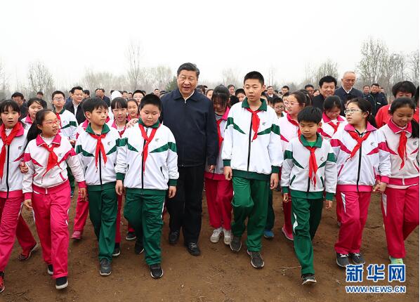4月2日,党和国家领导人习近平、李克强、栗战书、汪洋、王沪宁、赵乐际、韩正、王岐山等来到北京市通州区张家湾镇参加首都义务植树活动。这是植树活动结束时习近平同少先队员在一起。新华社记者 谢环驰 摄