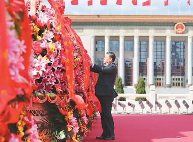 习近平迈步上前,仔细整理花篮缎带。接着,习近平等党和国家领导人缓步绕行,瞻仰人民英雄纪念碑。