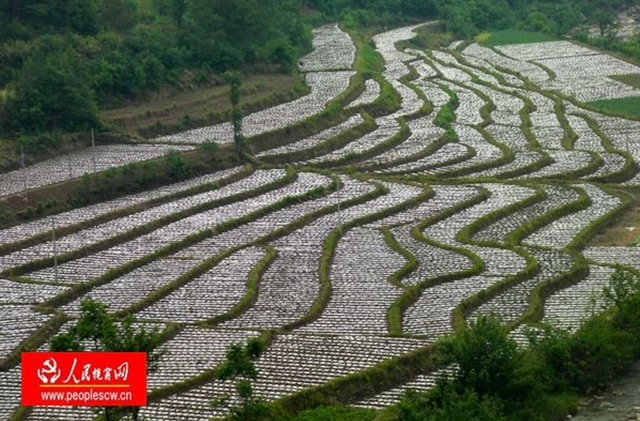 车驶进中原镇地域,透过车窗,路旁大片大片的坡地、田间,尺多高的核桃树苗,已经长出绿油油树叶;套种的烟苗已经穿透覆盖的地膜,露出胖胖的头;河沟对面山坡,桑树布满半边山。