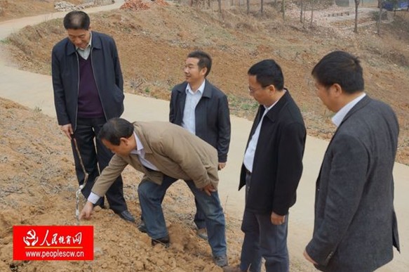 安康市原市委书记、现任安康市人大主任的刘建明(左一)、安康市委常委、汉滨区区委书记陈勇(右二)赴中原镇考察、调研百里万亩林果园长廊建设情况。