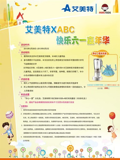 据报道,艾美特家电与ABC童装将在六一儿童节来临之际,举办“艾美特×ABC快乐六一嘉年华”活动,只要你拍下孩子可爱的瞬间,上传到微博上就可参加本次活动,最终评选出的优秀照片,将获得由艾美特家电和ABC童装共同提供的时尚大礼包。