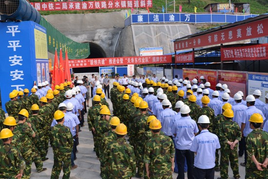 重庆市总工会,万州区总工会,万州区铁路建设领导小组办公室,建设单位渝黔、渝万铁路有限责任公司,监理单位北京铁研建设监理有限公司,施工单位中铁二局集团有限公司、中铁二局渝万项目各参建单位的领导以及项目部员工、农民工代表共180余人参加仪式。 (作者:蔡坤 廖金阳 王晓东)