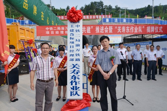 2013年5月28日,中铁二局渝万项目“联创共建”推进会暨“关寿东作业队”揭牌仪式在项目分水镇隧道斜井隆重举行。重庆市总工会党组成员、副主席鞠飞为项目部授“创重庆市工人先锋号”旗帜并揭牌;渝黔、渝万铁路有限责任公司董事长、总经理、党委书记王明慧,中铁二局党委书记邓元发作重要讲话。