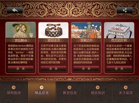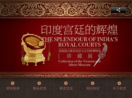 故宫博物院、英国国立维多利亚与艾伯特博物馆联合举办的“印度宫廷的辉煌——英国国立维多利亚与艾伯特博物馆珍藏展”在故宫午门展厅已开展有月余。近日,记者在苹果的App Store上发现一款名为“魅力故宫——印度宫廷的辉煌”的APP应用程序,据悉,此款App应用是为配合本次展览的宣传与推广,对于无暇亲临现场的观众可谓佳音。