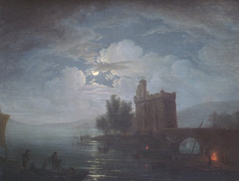 这幅被珍藏在巴黎美爵家族的风景油画《水面夜景》出自18世纪的法国画院,不同于一般风景油画的是,它是一幅在帆布上创作的油画,保存时间也相对一般油画来说更长久。这幅作品是作者在壮游期间完成的,当时那些外国画家,尤其是法国人,来到意大利来欣赏庞贝城刚刚被发掘的古罗马废墟,月光照耀下的湖面景色,湖边伫立着的单层城堡,这些都证明了作者想要通过这不寻常的一幅画来传达给观者的浪漫主义情怀和诗句。