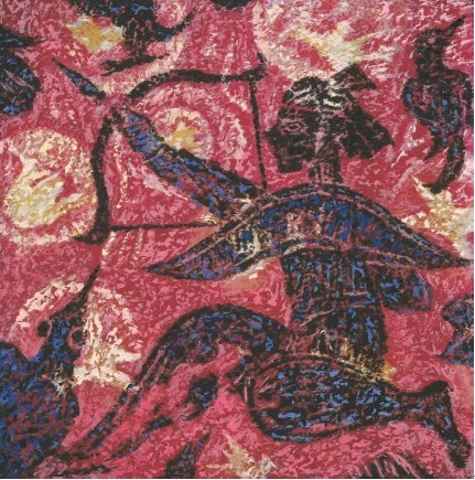 著名旅法画家罗小华,善于用色彩和独具特色的绘画手法进行创作。如今,罗小华成为巴黎美爵基金的签约画家,其作品再次掀起艺术界的关注。《后羿射日》是罗小华拜在宗师庞熏琴先生门下时期的作品,此时庞熏琴出版了极具影响力和历史价值的《中国古代装饰艺术》。对古代壁画的研究也是此时罗小华的研究方向之一。整幅画面都充满了象形文字一般的符号语言,但这幅作品的最大特点是对原有壁画技法的上的大胆创新和尝试。一方面后羿的形象更具有现代感,何为“现代感”,就是后羿的符号更具人的细节,表情和衣着更加具象和丰富。另一方面是在色彩上的大胆尝试,背景主色的选择颇具“时尚感”,让人有耳目一新的体验。后羿和火焰鸟的着色也很新颖。整幅画卷就是历史的沉重感和跳跃色彩的结合体。