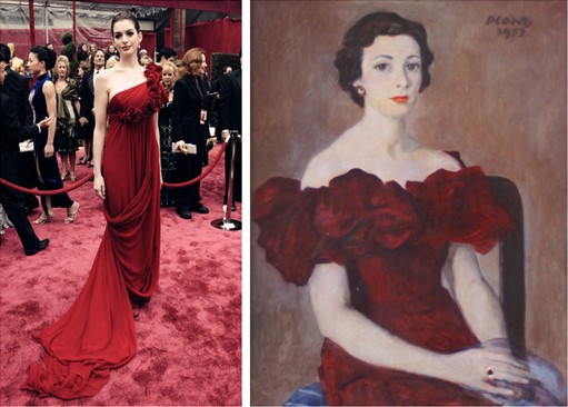 一个世纪过后,著名影星安妮·海瑟薇用自己的古典气质演绎着相似的裙装。在最近的一次颁奖典礼上,安妮·海瑟薇身穿玫瑰红礼服,衬托出她雪白的肌肤,别致的“玫瑰花环”恰到好处地增加上半身的层次感,小小耳环的点缀如画龙点睛。如果手中有橄榄叶,一定就跟希腊女神无异了。