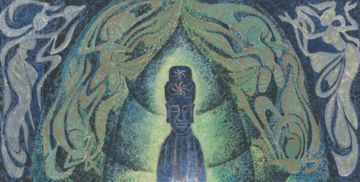 《飞天》这幅作品展现了罗小华独特的艺术天赋和绘画才华。整幅画富含了中国的岩画艺术、古代装饰艺术和中国传统水墨画法,作品中的佛像庄严肃穆,佛像周围散发出神的光辉,形象逼真。这种光晕效果的绘制来源于西方时尚的光效应艺术,罗小华将西方这一前卫艺术和谐的融入中国古典文化题材里,使作品更加真实,表达出的情感更加透彻。作品的周围是女子飘逸的飞天动作,这些仙女大比例的绘制,如同文章点题,让人一眼就能识别这幅画要表达的意思。婀娜的仙女在罗小华的笔下栩栩如生,鲜活灵动,对仙女独特的画法又让观众联想到古代岩画的神秘,同时,罗小华独创的蓝色调描绘让本应色彩鲜艳灿烂的宗教,便的深邃神秘,为神学添加了不可获知的虚幻色彩。