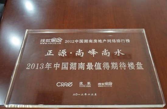 “2013年中国湖南最值得期待楼盘”奖是由中国不动产研究中心(CRRC)、搜狐焦点网新房中心提供2012年度各楼盘详情页访问量、论坛访问量、团购人数、电话来电量、成交量、综合指数等各项分析数据,组委会结合投票结果排名与分析数据排名,最终评选出正源长沙“正源尚峰尚水”荣获“2013年中国湖南最值得期待楼盘”。