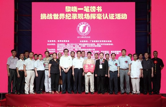 近日,由书法报社、湛江市文广新局、湛江市书法家协会、湛江市美术家协会、岭南艺术研究院、中共湛江市赤坎区委宣传部等单位联合在湛江举行 “一笔榜书挑战世界纪录”现场挥毫认证活动。书法家黎晓的一笔榜书得到世界纪录协会认证,认证师张健当场向黎晓先生颁发了“世界纪录”入选证书。