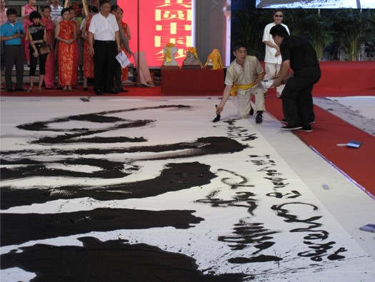 中年书法家黎晓先生身穿唐装,挥舞重约五十六斤巨笔,在52平米宣纸上书一“寿”字,稍息,又在另一56平米宣纸上书一“梦”字,两字均一笔完成,一气呵成,最后举起30公分见方,重达50公斤的巨型玉印盖在落款处,即告书成。此刻全场掌声四起,叫好不绝。