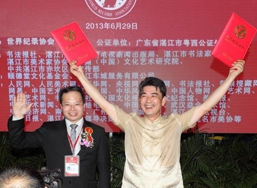 值中国共产党成立92周年之际,他在湛江现场挥毫表演一笔榜书“寿”“梦”两字,以此挑战世界纪录。