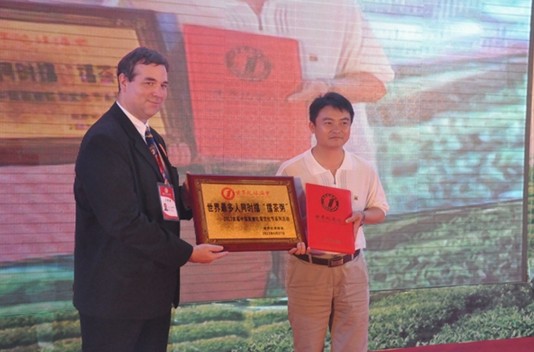 上图为世界纪录协会美国认证官大卫威廉向英德颁发擂茶粥世界纪录证书