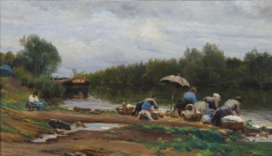 巴黎美爵基金收藏的《洗衣女工》,是法国画家查理斯•贝库斯十九世纪末的一幅乡村题材作品。描述了一幅河边劳作的女工场景,画家用独特的构图和笔调处理呈现给我们乡村特有的泥泞之感,空气中的静谧与清新真实的感染着每一个观赏者。画面描述了乡村、树木、静静流淌的小溪和正在洗衣的女工,将最淳朴的乡土气息表现的淋漓尽致平和中却透露出生活平淡中感动,触动着观赏者的心灵,同时也赢得了世界画坛的赞誉。