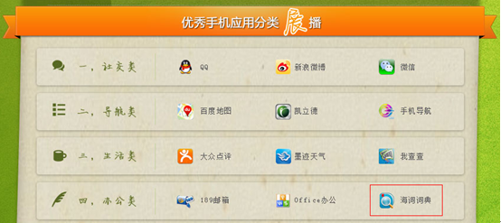 此次参与评选的海词词典,拥有十年品牌,一直秉承着对教育、对学生、对学习负责的态度研发互联网词典,目前已开发出针对不同学习人群的订制词典,包括:高考、四级、六级、考研,四方面的人群,深受学生喜爱。同时,海词词典也得到了活动举办方以及教育界、出版界的高度评价。此次绿色应用展播中,办公类应用推荐有,189邮箱、Office办公、海词词典。主办方表示,海词词典无广告、损耗内存极小、优质学习内容、支持数据转移至SD卡等方面内容入选此次优秀手机应用,是唯一一个入围的手机词典应用。