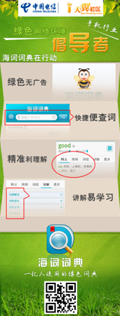 近期,中国电信旗下的i天翼社区响应工信部在5月初对外公布的《关于加强移动智能终端管理的通知》,携手中国通信企业协会发起了手机行业“绿色网络环境倡导者”主题活动推动。海词词典以其人群订制、优质内容、无广告、无插件、内存小、查词快等多方面优势成功获选为办公类最佳绿色应用,是唯一一个获选的手机词典。