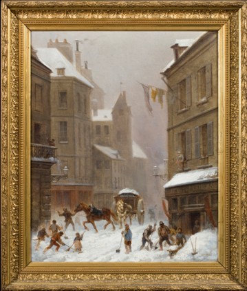查尔斯·梅赫的《雪后》,这幅画毫无疑问运用了现实主义手法,展现了19世纪末的莫城市民在一场影响城市日常运作的大雪后,纷纷参与扫雪,并把雪卸载到双驾马车上的场景。通过画者的写实笔法将城市之美通过笔和颜料展现在画面之上,让藏家、爱好者可以在画中漫步在城市中,去感悟街景之美。